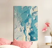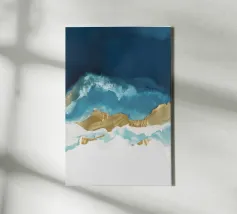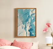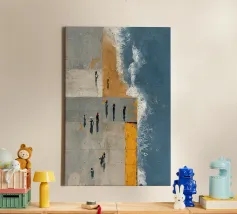 Quest'opera presenta una poetica veduta aerea di piccole figure che attraversano una vasta superficie ghiacciata, resa in morbidi blu e bianchi strutturati. Il ghiaccio, fessurato e stratificato, forma modelli astratti che ricordano le mappe naturali, mentre le piccole sagome umane introducono il movimento, la scala e una narrazione tranquilla. Lunghe ombre si allungano sulla superficie, sottolineando la distanza e l'immobilità. In equilibrio tra astrazione e realismo, la composizione riflette i temi della fragilità, dell'esplorazione e della presenza umana all'interno di immensi spazi naturali, rendendola un pezzo raffinato per interni contemporanei e stampe d'arte di grande formato.