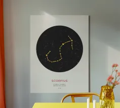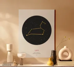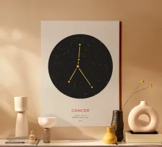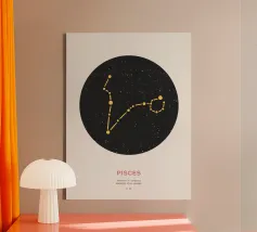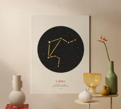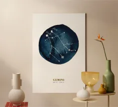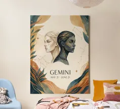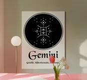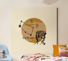 Questo disegno rappresenta il segno zodiacale dei Gemelli, simboleggiato da due gemelli in equilibrio e armonia. Con una composizione circolare, l'immagine gioca su elementi geometrici e punti stilizzati che evocano la dualità e la versatilità di questo segno. Le linee e i dettagli centrali sono equilibrati, suggerendo il legame tra le due personalità gemelle, mentre la disposizione dei punti intorno al cerchio enfatizza l'idea del movimento e del continuo cambiamento, tratti tipici dei Gemelli. Il design minimalista con contrasto bianco e nero lo rende elegante e facilmente adattabile a diversi stili di arredamento.