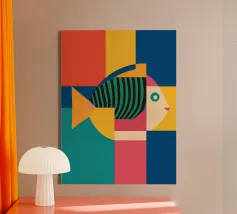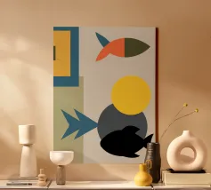 A geometric composition features a stylized orange fish against a backdrop of colored rectangles and circles, blending teal, black, and green shades. Bold shapes and contrasting colors create a modern, abstract aesthetic.