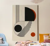 Forme e linee geometriche in nero e arancione creano un armonioso disegno astratto. L'equilibrio di semicerchi, cerchi e linee crea una composizione dinamica ma minimalista. Lo sfondo neutro esalta il contrasto tra i colori e le forme più vivaci.
