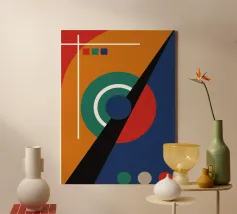 Una composizione di motivi geometrici presenta un cerchio con audaci strisce verticali rosse, gialle e verdi, intersecato da barre orizzontali e circondato da una varietà di rettangoli a scacchi e a tinta unita. Un mix di colori vivaci e tenui, insieme a linee nette, sono i motivi che caratterizzano la composizione.