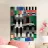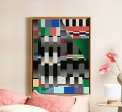 Forme geometriche audaci dominano la composizione, caratterizzata da un mix di colori e motivi come strisce e disegni a scacchi. La disposizione crea un'esperienza visiva vibrante e dinamica.