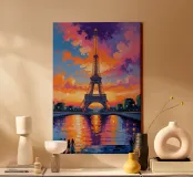 Questo dipinto a olio irradia l'essenza romantica di Parigi attraverso una rappresentazione impressionista della Torre Eiffel al tramonto. I toni dorati della torre si riflettono nell'acqua scintillante sottostante, creando una sinfonia visiva ipnotica. Il cielo, dipinto con caldi colori viola, arancioni e rosa, contrasta meravigliosamente con il blu intenso dell'acqua. Le sagome di coppie che camminano lungo la riva del fiume aggiungono un tocco umano, sottolineando l'intimità della scena. Le pennellate vibranti ma morbide evocano un legame emotivo, rendendo quest'opera d'arte un tributo al fascino duraturo della Città della Luce.