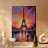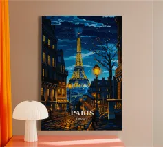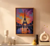 Questa raffigurazione impressionista della Torre Eiffel mette in risalto il suo bagliore dorato durante le serene ore del crepuscolo. L'opera combina audaci pennellate di colori caldi con toni più freddi per creare un contrasto armonioso. I riflessi nella Senna accentuano la grandezza della torre, mentre le coppie che camminano lungo l'argine aggiungono una dimensione intima. La tavolozza luminosa e le pennellate dinamiche catturano la bellezza eterea del crepuscolo parigino, rendendo il dipinto un omaggio poetico al romanticismo e al fascino della Città della Luce.