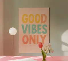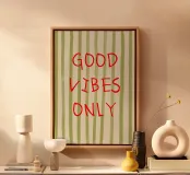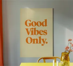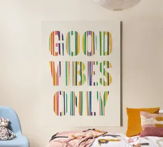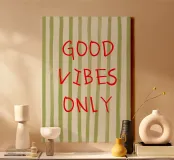 Un messaggio luminoso ed edificante per una casa felice. Questa scritta a mano riporta la classica frase "GOOD VIBES ONLY" su un allegro sfondo a righe.
