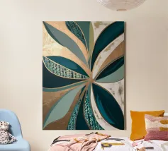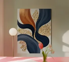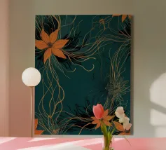 This captivating abstract artwork draws inspiration from the beauty of nature, blending organic forms with bold colors and delicate lines. The vibrant teal background serves as a canvas for a mesmerizing interplay of golden and black elements, creating a sense of movement and energy. The artwork evokes a feeling of harmony and balance, inviting viewers to explore the intricate details and appreciate the beauty in the abstract.