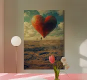 Un cuore colossale e consumato dalle intemperie fluttua serenamente sopra un vasto paesaggio incrinato, simbolo potente di un amore duraturo in un mondo desolato. Due piccole figure si ergono al suo cospetto, aggiungendo la scala epica e l'atmosfera cinematografica di questa opera d'arte surreale. Con i suoi toni vintage e le sue immagini che fanno riflettere, quest'opera è un invito alla conversazione e un tributo al grande viaggio dell'amore.