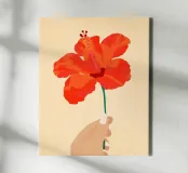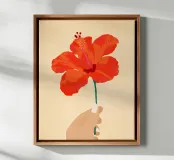 "Hibiscus Affection" mostra il dolce abbraccio di un ibisco arancione nella mano, catturando il calore e la tenerezza della connessione umana con la natura. La fioritura vibrante simboleggia l'amore e la tranquillità, offrendo un momento di serena bellezza.
