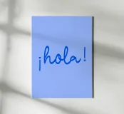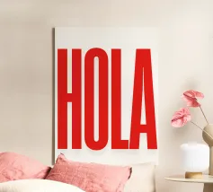 Stampa su tela minimalista con scritta "Hola" in blu su sfondo celeste, ideale per decorare soggiorni, uffici e spazi moderni. Realizzato con materiali di qualità, resistente e conforme agli standard UE, perfetto per chi cerca un tocco di allegria e semplicità visiva senza personalizzazione.