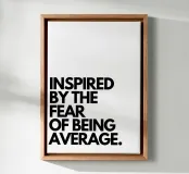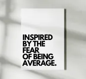 "La frase "INSPIRED BY THE FEAR OF BEING AVERAGE!", impilata su più righe e resa con un carattere sans-serif nero in grassetto su uno sfondo bianco pieno, trasmette un messaggio di ambizione e di spinta a eccellere",