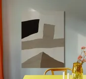 Forme astratte in varie tonalità di marrone e nero si sovrappongono su uno sfondo beige, formando una composizione che può evocare un senso di paesaggio o di architettura. La semplicità delle forme e la palette di colori della terra conferiscono al pezzo un'atmosfera minimalista e moderna.