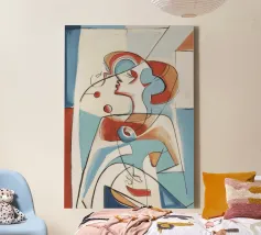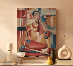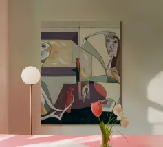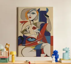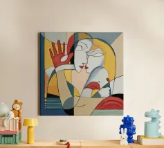 Questo dipinto presenta due figure astratte in una posa intima e ravvicinata. L'uso di forme geometriche e di colori decisi aggiunge profondità e complessità alla scena.