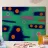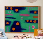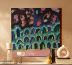 Quadro astratto con una vibrante composizione di forme e colori. Lo sfondo è una miscela strutturata di tonalità verdi che crea un'illusione di profondità. Sulla tela sono sparsi audaci cerchi arancioni, alcuni pieni e altri con i soli contorni, che contrastano nettamente con il verde. Intermittenti tratti rosa aggiungono calore alla scena, mentre le linee tratteggiate viola danno un ritmo giocoso. Alcuni cerchi grigi solitari sembrano fluttuare in questo paesaggio onirico. Quest'opera d'arte evoca un senso di estrosità grazie all'uso di giustapposizioni di colori e di forme geometriche varie.