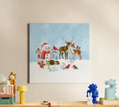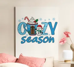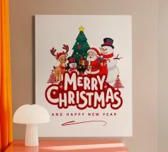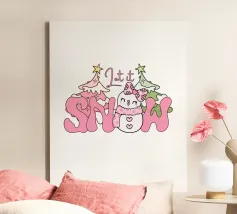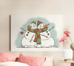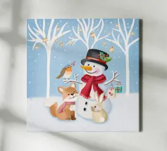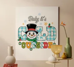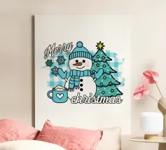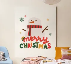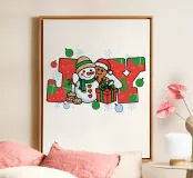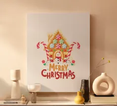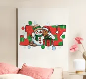 Un allegro pupazzo di neve e un omino di pan di zenzero si trovano accanto a una grande scritta rossa "JOY" ornata da fiocchi di neve e circondata da decorazioni natalizie. Scatole regalo e ornamenti festosi completano il tema stagionale.