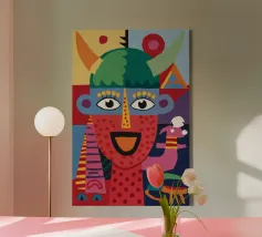 Un vivace volto astratto, infuso di motivi giocosi e contrasti audaci, emana esuberanza e celebrazione.