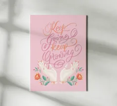 Una dolce spinta per rimanere in carreggiata. Questa stampa murale motivazionale riporta le parole "Keep Going" in un audace stile letterato a mano, sullo sfondo di un morbido acquerello con accenti botanici - perfetto per l'ispirazione quotidiana in qualsiasi spazio.