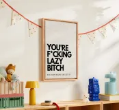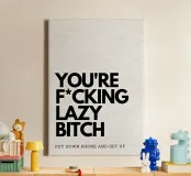 "Le parole 'YOU'RE F*CKING LAZY BITCH' sono impilate in un carattere sans-serif nero in grassetto, con l'asterisco che censura la 'U' di 'FUCKING', seguito dalla frase 'PUT DOWN PHONE AND GET UP' in un carattere serif più piccolo e delicato, il tutto su uno sfondo bianco sporco",