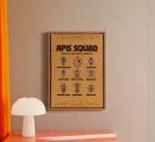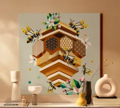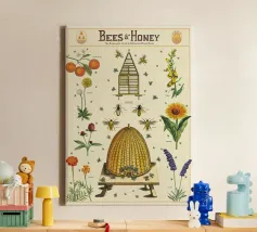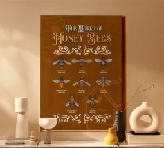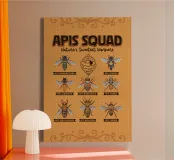 Questo affascinante disegno mostra nove diverse specie di api mellifere del genere Apis su uno sfondo uniformemente disegnato. Ogni ape è graficamente stilizzata ma fedelmente riprodotta ed etichettata con il suo nome scientifico, da Apis mellifera ad Apis dorsata. Al centro è presente un alveare decorativo che completa esteticamente il tema. Ideale per gli amanti della natura, gli apicoltori, gli insegnanti di biologia o come murale educativo nella stanza dei bambini o in classe.