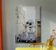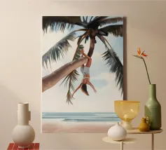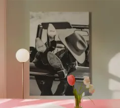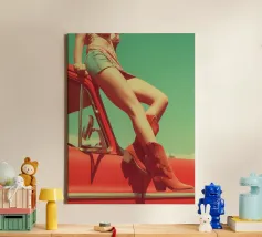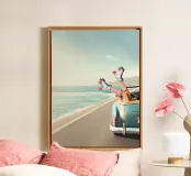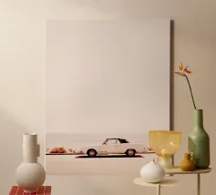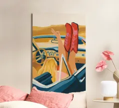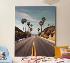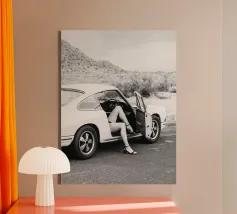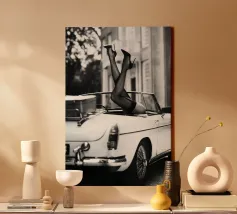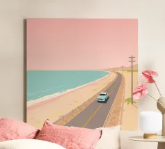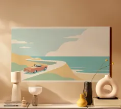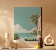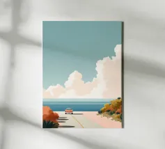 Sperimentate la massima libertà e avventura con le nostre opere d'arte vintage. Sentite il sole sulla pelle mentre guidate lungo la costa in una classica decappottabile. Immaginate il vento tra i capelli mentre una pattinatrice spensierata scivola sull'oceano. Questo capolavoro cattura la nostalgia di un viaggio in auto retrò e vi avvicina alla bellezza di una vita senza limiti. Perfetto per ogni appassionato di arte e avventura".