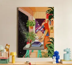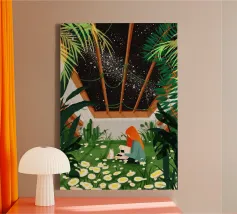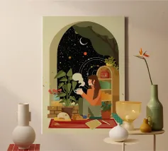 libri libreria lettura piante verde piante in vaso scaffale decorativo libri su scaffali donna che legge piante da interno amante dei libri piante appese cosmo stelle cielo notturno interno relax angolo accogliente arredamento astronomico tema celeste