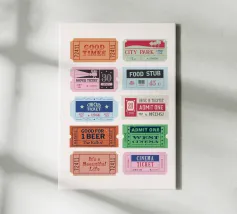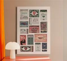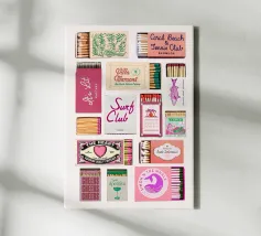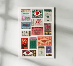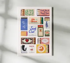 Un mix artistico di fiammiferi d'epoca provenienti da caffè, ristoranti e città costiere emblematiche. Questo disegno emana un fascino retrò e ricorda i viaggi in macchina, le caffetterie e i ristoranti di pesce in riva al mare. Ideale per tutti coloro che amano la tipografia, la storia del design e la magia delle piccole cose, perfetto per cucine, pareti di gallerie o spazi di lavoro creativi.