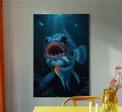 L'incubo delle profondità marine prende vita in questo dipinto a olio iperrealistico, che raffigura una bestia marina incandescente che naviga nell'oscurità degli abissi. Con la sua bocca massiccia rivestita di zanne frastagliate e viticci bioluminescenti che pendono dalla mascella, questo cacciatore è un vero e proprio predatore delle profondità oceaniche. L'inquietante bagliore che si riflette sull'acqua circostante crea un'atmosfera ultraterrena, mettendo in risalto la forma slanciata ma mostruosa del predatore. Questa splendida opera d'arte immerge lo spettatore nel mondo silenzioso e implacabile della sopravvivenza nelle profondità marine.