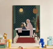 The painting portrays a person relaxing in a vintage-style bathtub, surrounded by a dark green tiled bathroom. They are reading a book, with a towel wrapped around their head. The warm lighting and elegant decor create a luxurious and tranquil atmosphere.