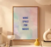 "Make space for magic" in blue lettering on a pastel watercolour background with a colour gradient from light blue to pink. A dreamlike, creative design full of lightness, inspiration and gentle self-reflection.
