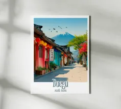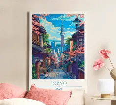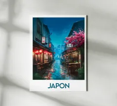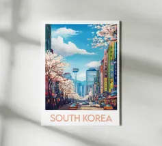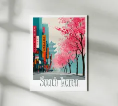 Scoprite Seoul, una città dove la modernità incontra la tradizione. Questo poster mostra una strada vivace fiancheggiata da negozi tradizionali, alberi di ciliegio in fiore e grattacieli sullo sfondo. Una celebrazione dell'energia e del fascino unico della capitale coreana.