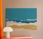 Un collage astratto contemporaneo che cattura la bellezza strutturata del litorale. Strati di carta strappata imitano l'incontro ritmico di mare, surf e sabbia, evocando l'energia calma e dinamica della costa.
