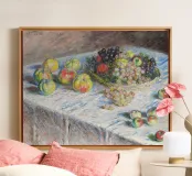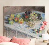 Un'affascinante natura morta del maestro impressionista Claude Monet, che mette in mostra la tranquilla eleganza degli oggetti quotidiani Presenta una disposizione rustica di mele e uva su un tavolo rivestito di bianco, immerso in una morbida luce naturale Cattura la bellezza fugace della frutta matura con pennellate sciolte e tonalità calde e autunnali Un'opera intima che si discosta dai famosi paesaggi di Monet e che è stata dipinta in casa durante il maltempo. Un'opera d'arte senza tempo e rilassante, perfetta per cucine, sale da pranzo o qualsiasi altro interno accogliente Regalo ideale per gli amanti dell'arte, per i cuochi o per chi apprezza l'estetica rustica e la natura morta
