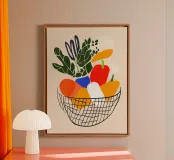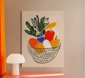 Immergetevi nell'atmosfera di un mercato assolato con questa illustrazione artistica e luminosa. Un cesto traboccante di verdure colorate, catturato in una composizione grafica audace e minimalista. Quest'opera è perfetta per ravvivare un interno alla ricerca di freschezza e genuinità. Un vibrante omaggio ai piaceri semplici e naturali della cucina.