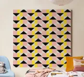 I motivi geometrici si ripetono in un design simmetrico, caratterizzato da triangoli e rettangoli nei colori nero, giallo e rosa. La disposizione strutturata crea una composizione ordinata e di grande impatto visivo.