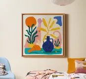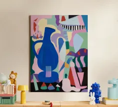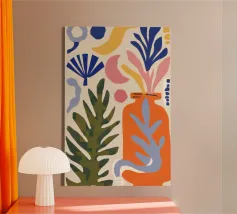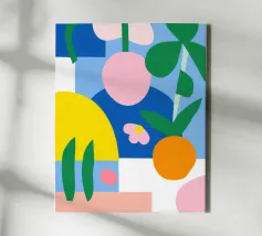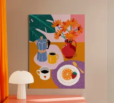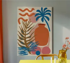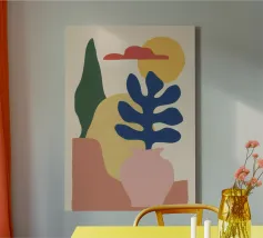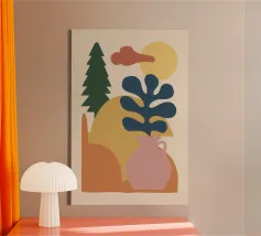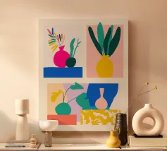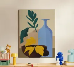 Una moderna natura morta astratta con una pianta stilizzata in un vaso blu, un croissant e forme organiche sotto un sole giallo, il tutto in una composizione equilibrata e calda.