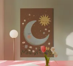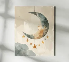 Canvas illustrativo minimalista raffigurante una luna stilizzata con volto dolce e stella sospesa, perfetto per decorare camerette di bambini e ambienti nursery. Realizzato con materiali di alta qualità secondo standard europei, ideale come regalo originale per neonati e bambini.