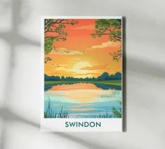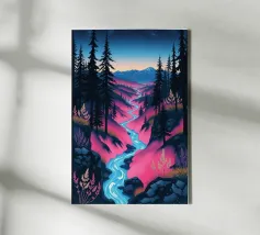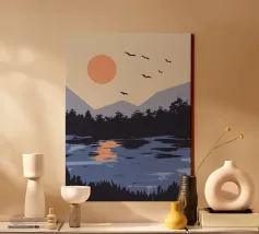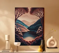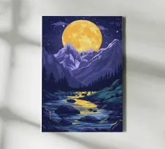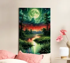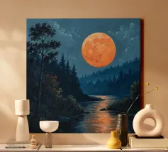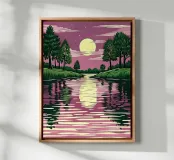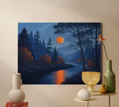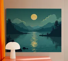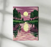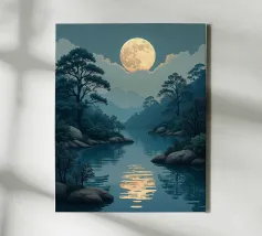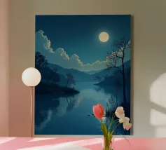 Un dipinto di paesaggio sereno che raffigura un lago calmo che riflette la luna piena su un cielo viola. Gli alberi costeggiano la riva, creando un'atmosfera pacifica.