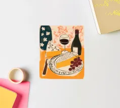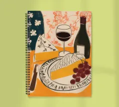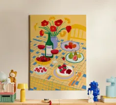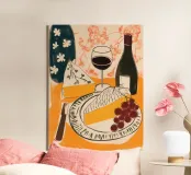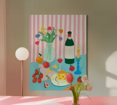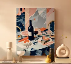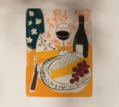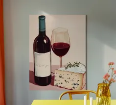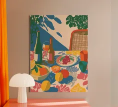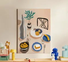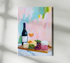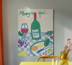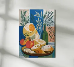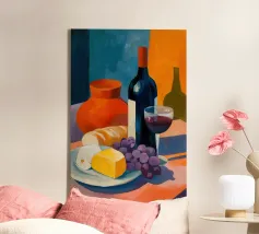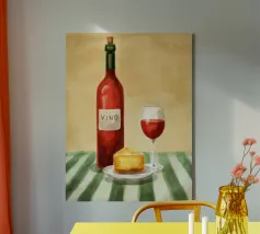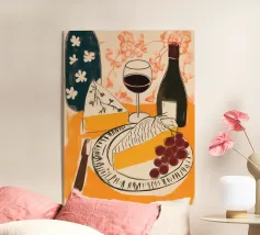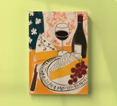 Gioia culinaria in uno stile trendy e artigianale: questa affascinante natura morta celebra l'arte di assaporare. La tavolozza calda - giallo oro brillante, albicocca delicata, petrolio intenso - ricorda i manifesti dei bistrot francesi. Il tratto sciolto dell'inchiostro e i motivi floreali decorativi creano un'eleganza rilassata. Formaggio, vino, uva e stoviglie floreali sono disposti in un inno allo stile di vita mediterraneo. Lo stile pittorico bidimensionale mostra anche influenze del design scandinavo. Un'opera d'arte appetitosa per buongustai e intenditori, perfetta per la cucina, la sala da pranzo o il ristorante.