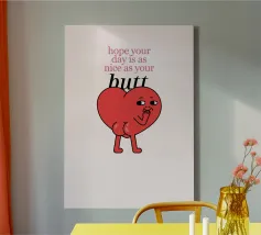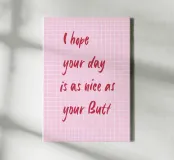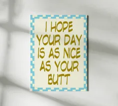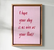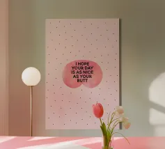 Bellissima stampa con la scritta: "Spero che la tua giornata sia bella come il tuo sedere!". Scritta rossa su un motivo a quadri bianchi e rosa.