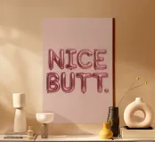 "Nice Butt" in lettere rosa metallizzate su sfondo rosa. La giocosa tipografia a palloncino combina elementi 3D e 2D in un design carino ed estetico - moderno, affascinante e perfetto per gli appassionati di arte tipografica.