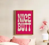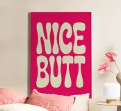 Design tipografico giocoso con la scritta "NICE BUTT" in lettere arrotondate color crema su uno sfondo rosa acceso. Le lettere sembrano bolle di sapone con forme uniche e irregolari, per una dichiarazione spiritosa e accattivante.