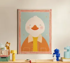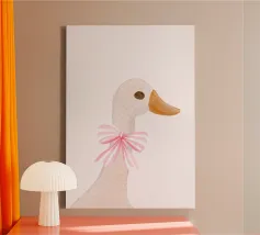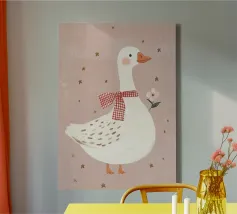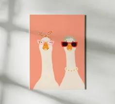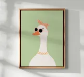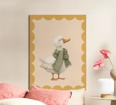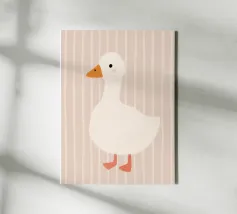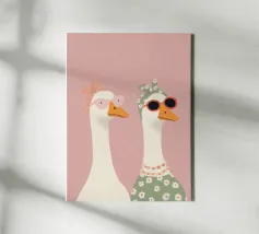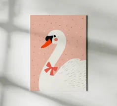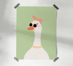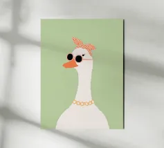 Questa elegante illustrazione di un'oca dona un tocco di giocosa eleganza a qualsiasi spazio. Raffigurante un'oca dal collo lungo e aggraziato che indossa occhiali da sole rotondi color rosa cipria e un foulard fantasia, quest'opera d'arte fonde il fascino vintage con uno stile moderno e minimalista. Perfetta per camerette, camere dei bambini o pareti eclettiche, questa stampa alla moda con un'oca aggiunge personalità, umorismo e un tocco di tendenza al tuo arredamento. Bella da esporre da sola o abbinata ad altre stampe di animali coordinate per una collezione coerente ed elegante.