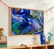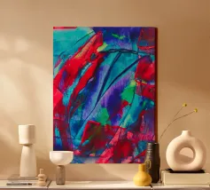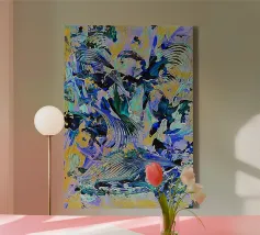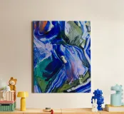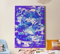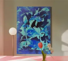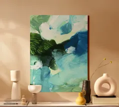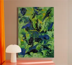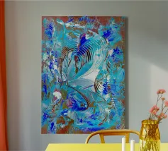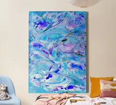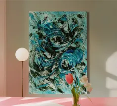 "Ocean" è un'astrazione dinamica e tattile che cattura la potenza e il movimento del mare. La composizione è dominata da un blu fluente in varie tonalità, dall'oltremare profondo all'azzurro chiaro. Accenti verdi, bianchi e arancioni sono incorporati nei vortici blu e danno l'impressione di spruzzi marini, alghe o luce riflessa. Le spesse e curve pennellate di colore (probabilmente acrilico o olio) creano una texture turbolenta, quasi ipnotica, e simboleggiano l'infinita profondità e l'incessante cambiamento delle correnti oceaniche.