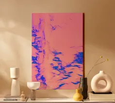 Splendida arte astratta fluida, ispirata a una tranquilla spiaggia rosa, con flussi di colore in blu acqua e rosa pastello.