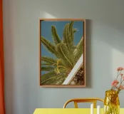 A detailed composition of sunlit palm fronds overlapping in elegant curves. With a soft teal backdrop and architectural accents, this image offers a fresh tropical perspective—ideal for editorial decor or botanical-inspired spaces.