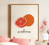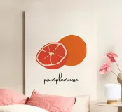 Disegno di un pompelmo con testo in francese: Pamplemousse. Generato con l'AI (Canva), tra le altre cose.