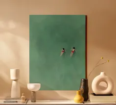 Scivolando fianco a fianco in un mare turchese, due nuotatori tracciano percorsi sincronizzati che si increspano verso l'esterno in archi delicati. Realizzato con audaci pennellate di olio, "Parallel Currents" cattura un tranquillo duetto di movimento e quiete, dove le figure umane e la distesa acquatica si fondono in un sereno balletto di colori e forme.