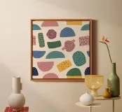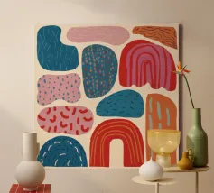 Un motivo delicato e piacevole di forme astratte e organiche in colori pastello come il rosa, il blu e il giallo, che crea un design morbido, moderno e allegro.