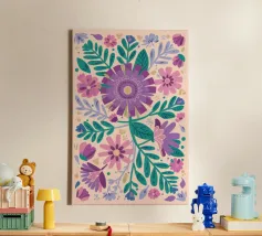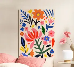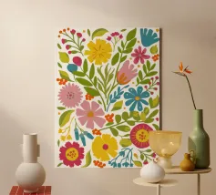 Una bella macchia di fiori selvatici stilizzati e stravaganti è illustrata in un affascinante stile ispirato all'arte popolare, con un delizioso mix di colori e forme che irradiano gioia e bellezza naturale.