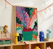 Una composizione astratta presenta una ciotola di fragole in mezzo a un turbinio di forme e motivi organici e colorati, creando un'interpretazione fresca e moderna di un classico dell'estate.