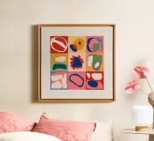 Una composizione astratta moderna e giocosa, caratterizzata da una disposizione a griglia di forme organiche e colorate. L'opera si presenta come un puzzle sofisticato ed equilibrato di forme e colori.